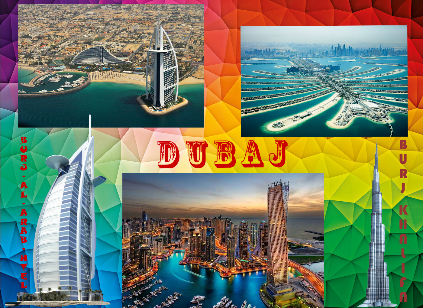 Przygotuj pocztówkę z Dubaju wykorzystując poniższe zdjęcia. Burj Khalifa i Burj-Al-Arab-Hotel wstaw bez tła.