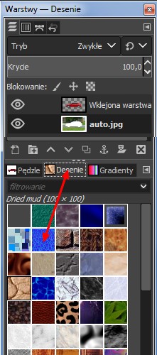 Teraz kliknij na drugą warstwę z całym obrazem i wybierz w dolnej części "deseń". Wybierz przykładowy. Następnie w narzędziach głównych kliknij na "wypełnienie" i kliknij w obrazek.